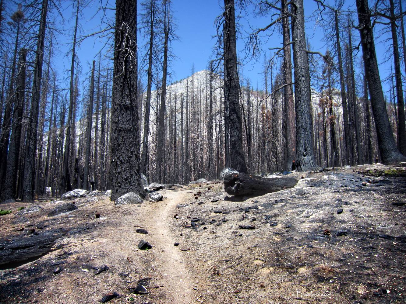 Meadow Fire Area 2 - John Muir Trail Meadow Fire burn area one year later. California, Sierra Nevada Mountains, Yosemite National Park, Meadow Fire. John Muir Trail Mile 008.
