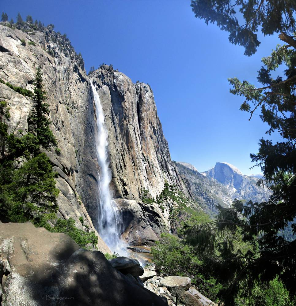 Upper Yosemite Falls - Yosemite Upper Yosemite Falls with Half Dome in the background from the Yosemite Falls Trail. California, Sierra Nevada mountains, Yosemite National Park, Yosemite Valley. Off the John Muir Trail near Mile 000.