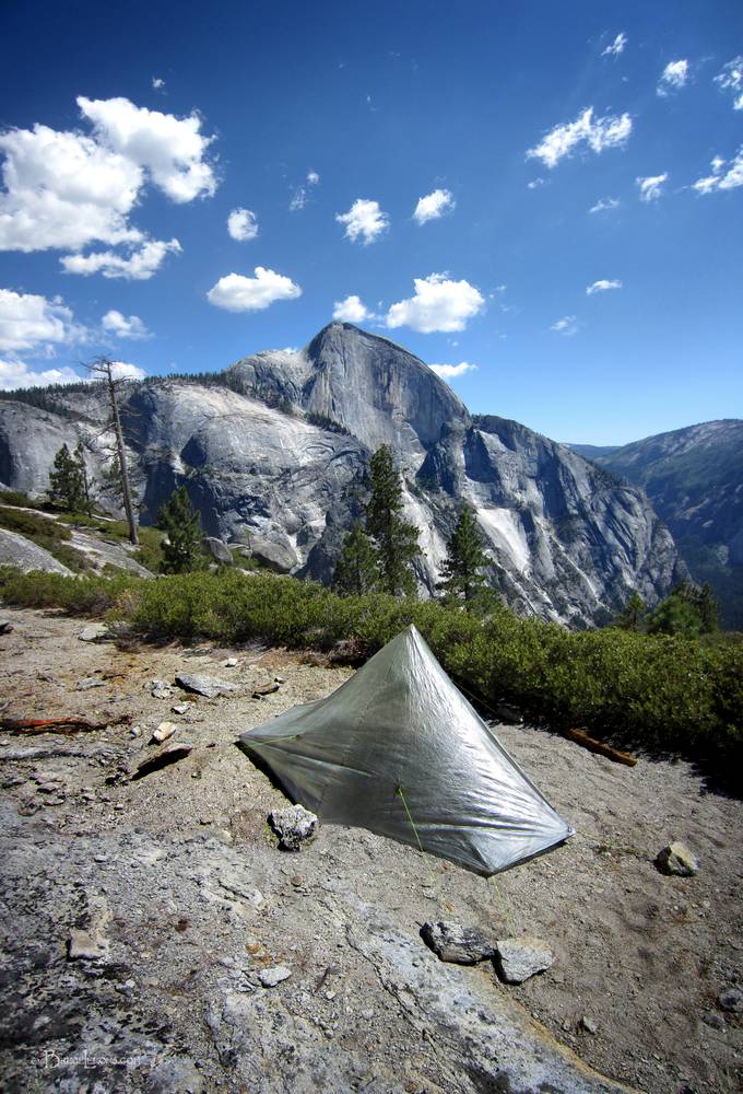 Snow Creek campsite view of Half Dome directly across Yosemite Valley. California, Sierra Nevada Mountains, Yosemite, Snow Creek. Off the John Muir Trail near Mile 000.