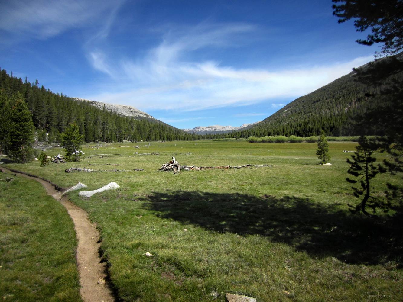 Looking NNW down Lyell Canyon past potter Point at right. California, Sierra Nevada mountains, Yosemite National Park. John Muir Trail near Mile 031.