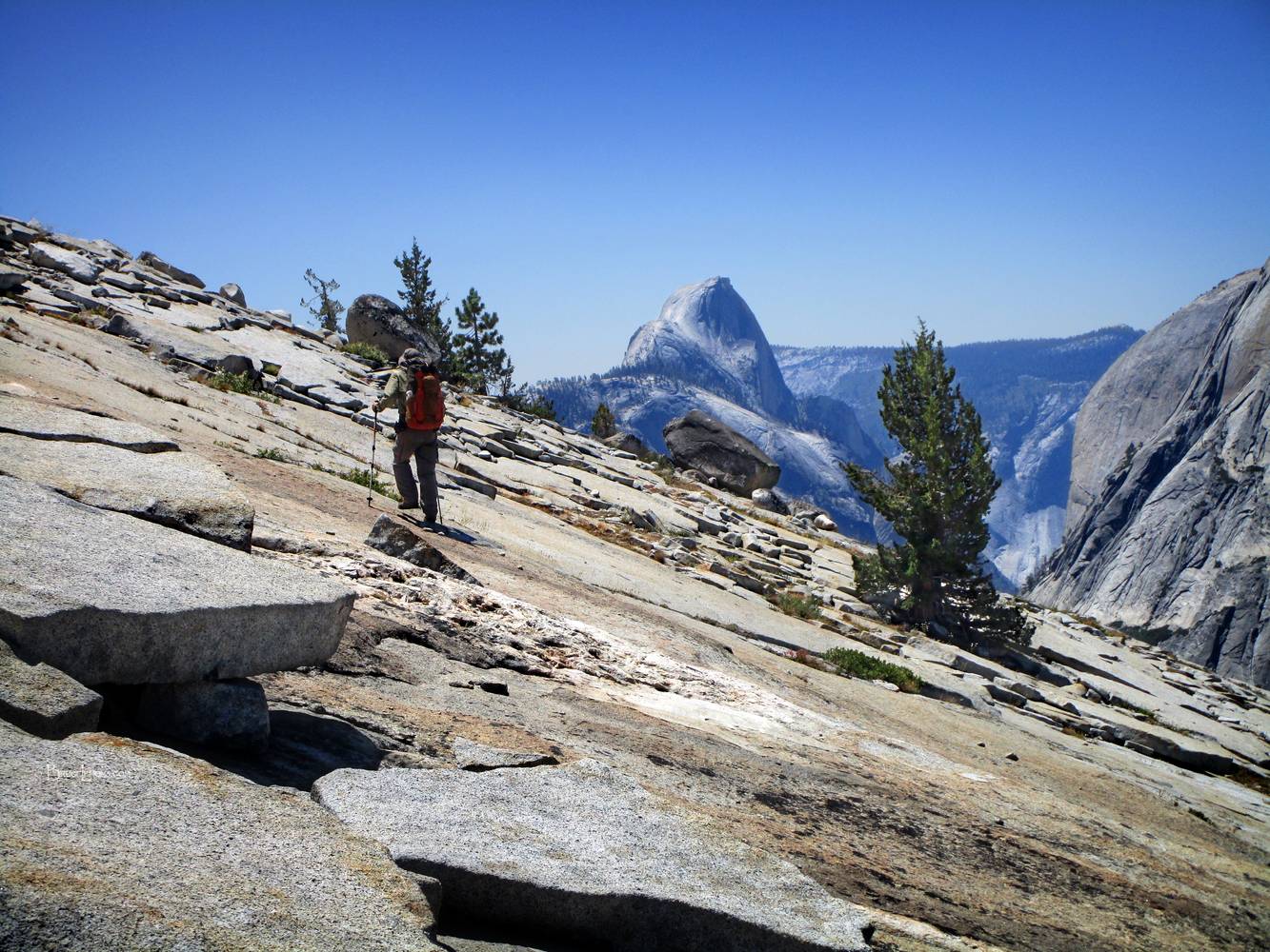 Half Dome from the Ridge S of Olmstead Point - Yosemite Hiker on the ridge S of Olmstead Point, looking SSW to Half Dome. California, Sierra Nevada Mountains, Yosemite National Park, Upper Tenaya Canyon. Off the John Muir Trail near Mile 014.