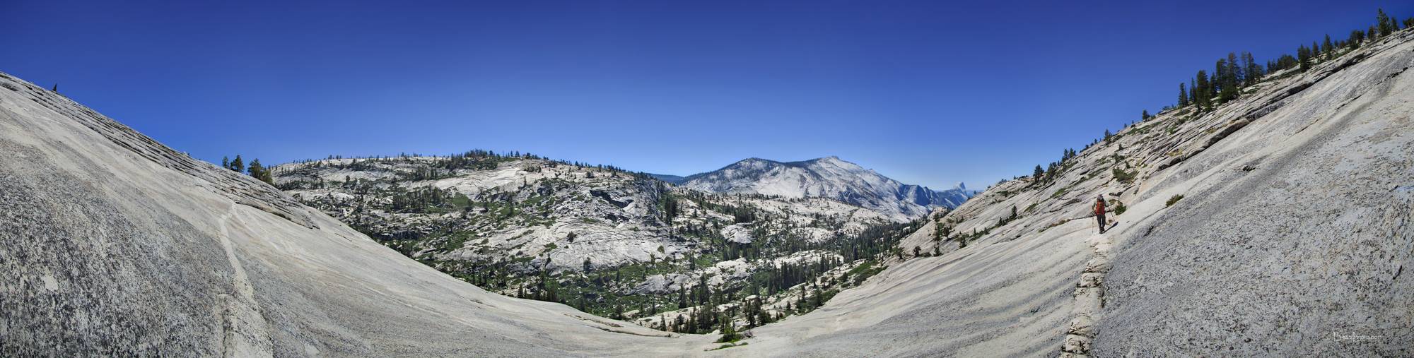 Hiker on the slabs S of Olmstead Point, looking SSW to the upper end of Tenaya Canyon, with Clouds Rest and Half Dome visible on the horizon center left. California, Sierra Nevada Mountains, Yosemite National Park, Upper Tenaya Canyon. Off the John Muir Trail near Mile 014.