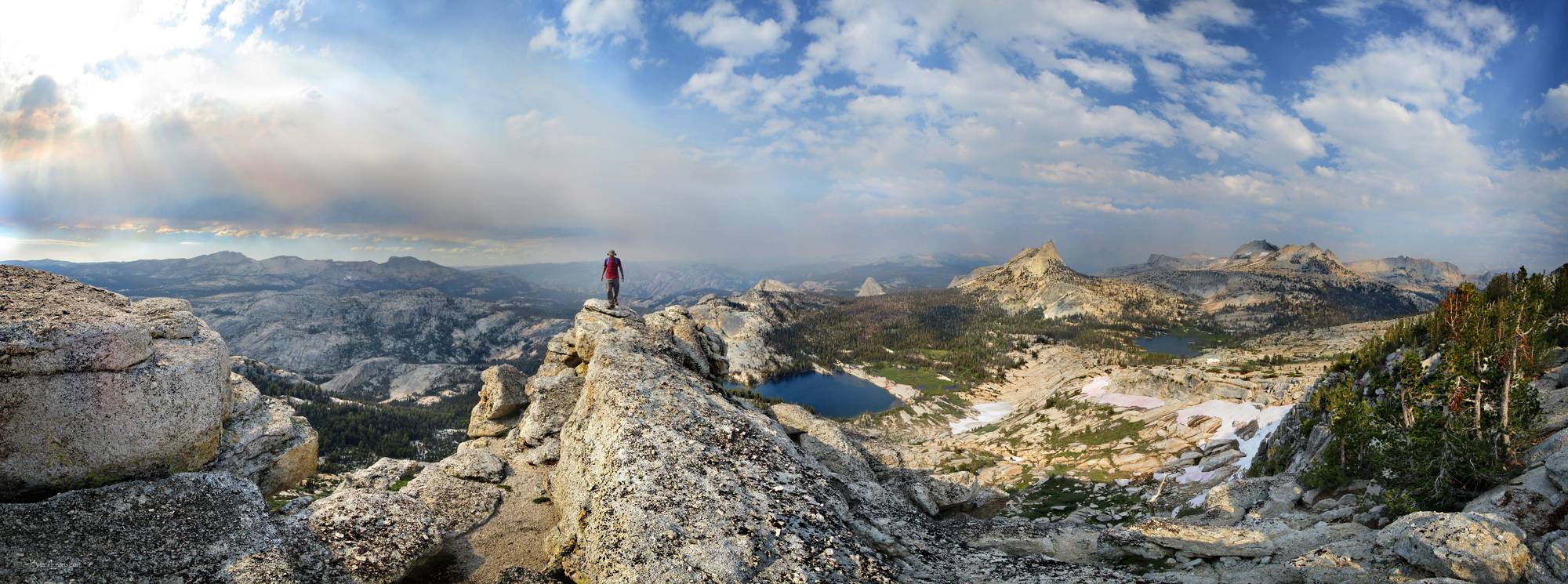 Cathedral Lakes Panorama - Yosemite Panorama from the peak S above Lower Cathedral Lake with climber walking a narrow outcrop. California, Sierra Nevada Mountains,Yosemite, Cathedral Lakes. Off the John Muir Trail near Mile 018.