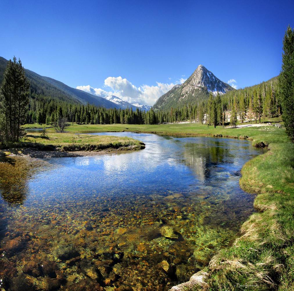 Looking SSE down Lyell Canyon along the Lyell Fork of the Tuolumne River to Potter Point on the right and Donahue Pass in the far distance at center. California, Sierra Nevada Mountains, Yosemite National Park, Lyell Canyon. John Muir Trail Mile 029.