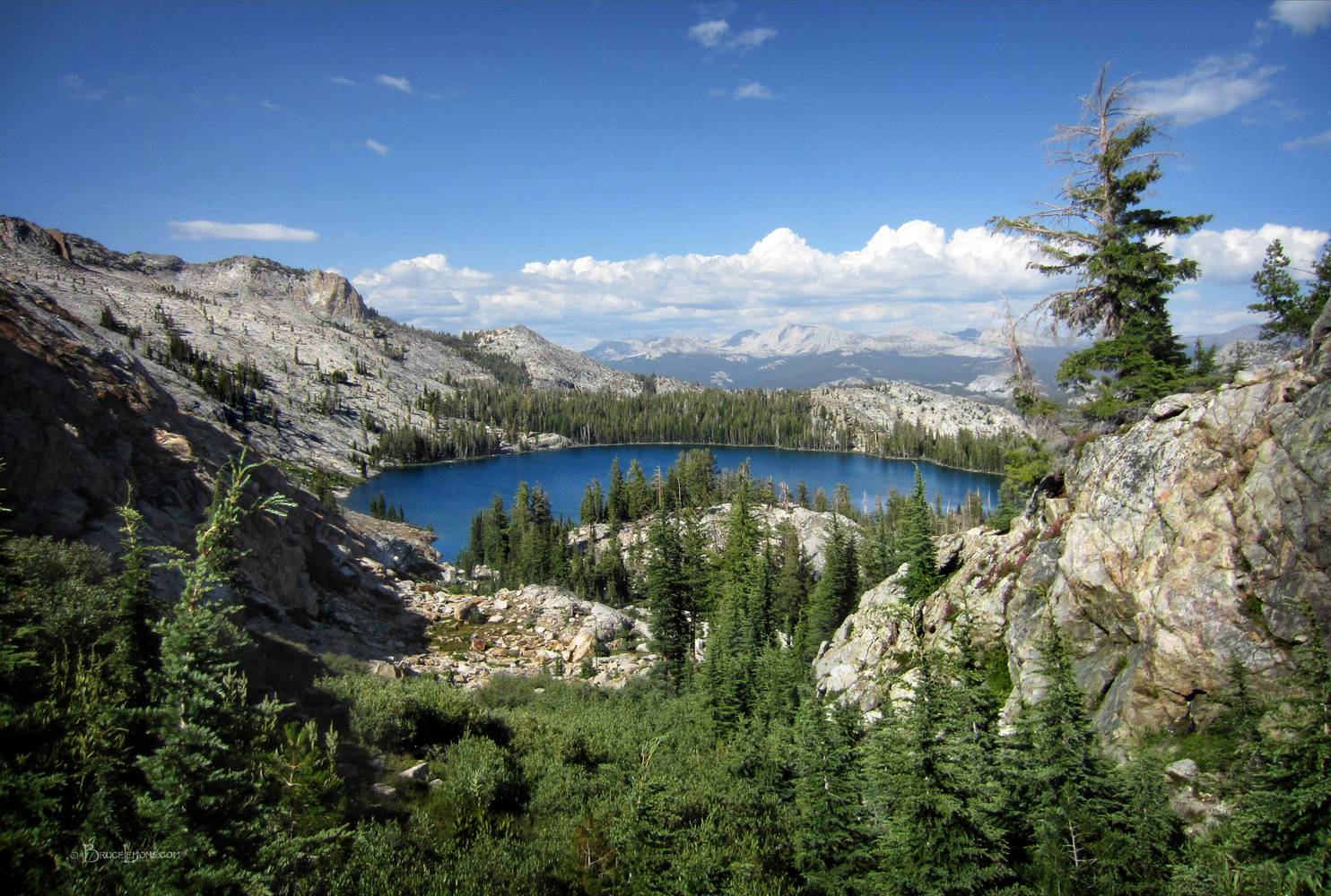 Looking NNE over May Lake from the Mt Hoffman trail. California, Sierra Nevada Mountains, Yosemite, May Lake Off the John Muir Trail near Mile 014.