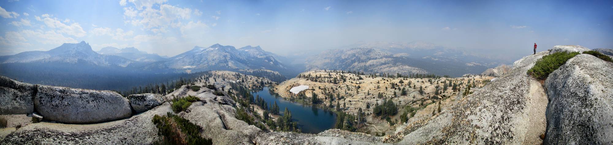 Looking SW overthe S lake on Medlicott Dome. Cathedral Peak at left, Lower Cathedral Lake faintly visible center left, and Tenaya lake faintly visible in distance at center. California, Sierra Nevada Mountains, Yosemite. Off the John Muir Trail near Mile 018.
