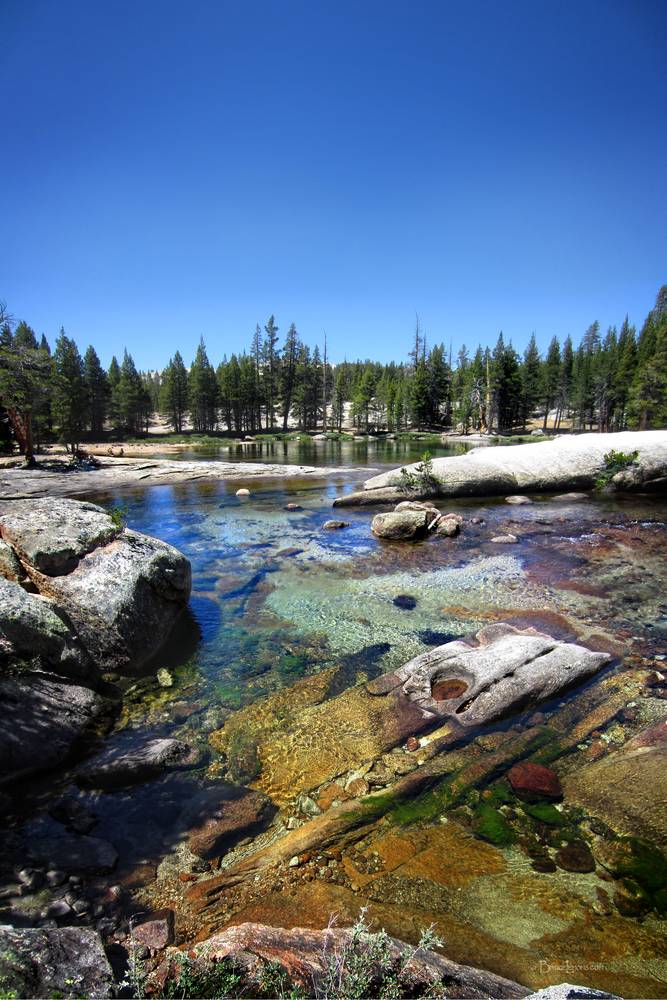 Tuolumne River Shallows - John Muir Trail Tuolumne River shallows, rapids, and wading pools at Tuolumne Meadows. California, Sierra Nevada Mountains, Yosemite National Park, Tuolumne Meadows, Tuolumne River. John Muir Trail Mile 024.