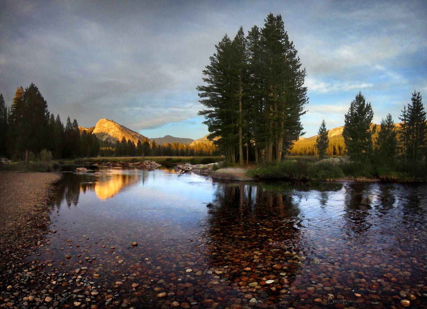 Lembert Dome Over the Tuolumne River and Meadows - Yosemite Looking E across Tuolumne Meadows with Lembert Dome reflected in the Tuolumne River. California, Sierra Nevada Mountains,Yosemite, Tuolumne Meadows. John Muir Trail Mile 024.