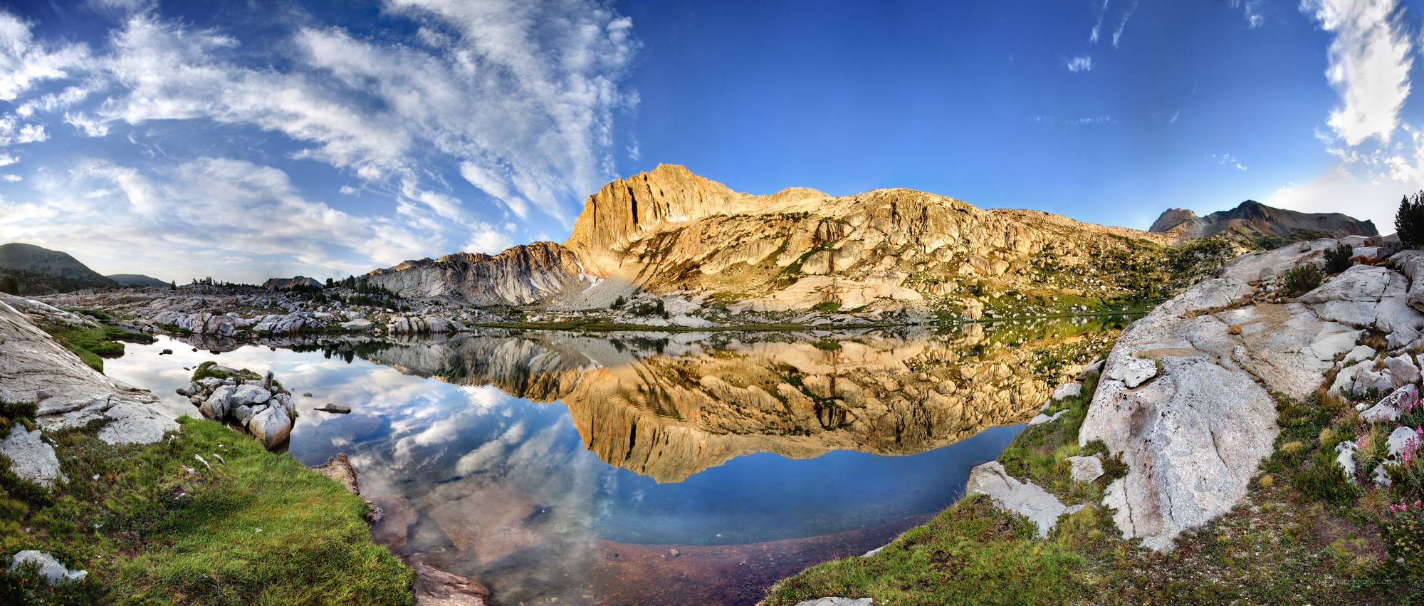 Sunrise on North Peak over Cascade Lake - Sierra Looking SW across Cascade Lake to North Peak at sunrise. California, Sierra Nevada Mountains, Hoover Wilderness, Cascade Lake. Off the John Muir Trail near Mile 023.