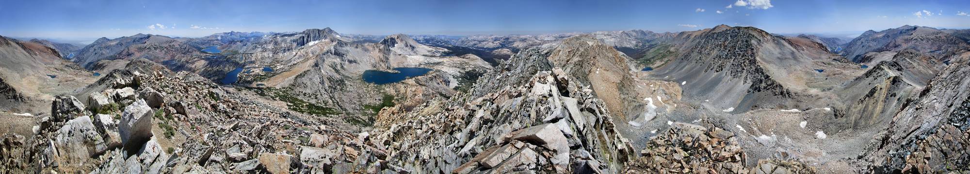 360 panorama from Shepherd Crest East looking SW, with Saddlebag, Steelhead, and Cascade Lakes to left, North Peak, Mt Conness, Sheep Peak, and Upper McCabe Lake at center, Sheperd Lake and Excelsior Mtn at center right, and Sky Pilot Pass at left. California, Sierra Nevada Mountains, Yosemite, Shepherd Crest East. Off the John Muir Trail near Mile 023.