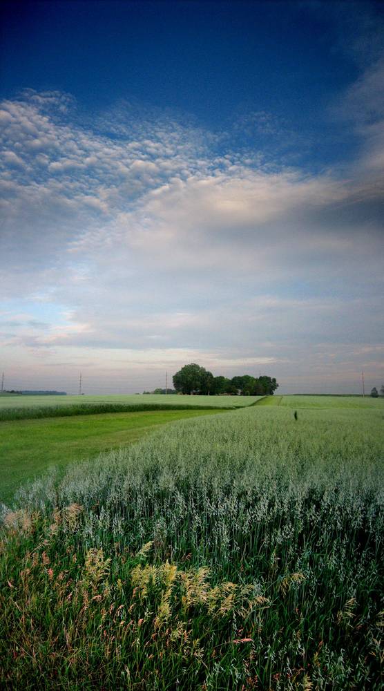 Cental Iowa Oat Field 2 Landscape of a lush green wheat field and farmstead under a bright blue cloudy sky.