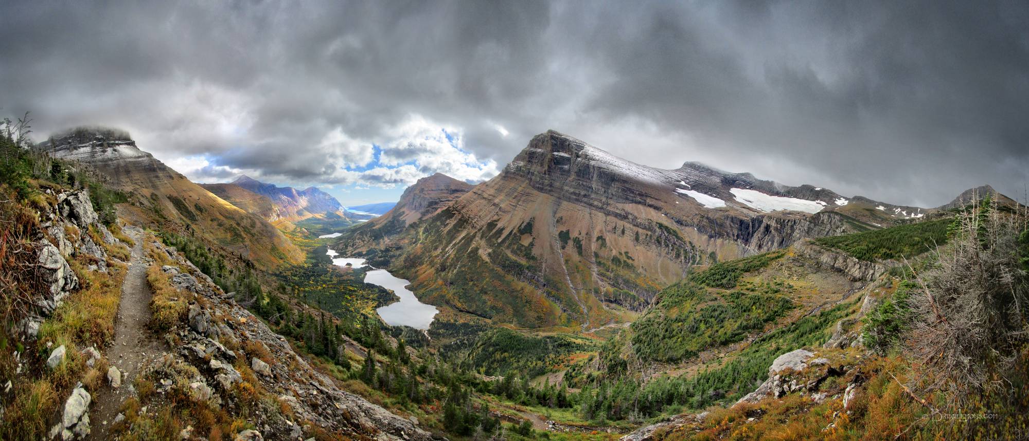 Looking East from the upper basin below Swiftcurrent Pass over the string of lakes lining the Swiftcurrent Trail leading to Many Glacier 5 miles down valley. Dumbell shaped Bullhead Lake closest, Redrock Lake at center, Many Glacier and civilization at the valley turn, and Lake Sherburne near the horizon and farthest. Mt Wilbur is at left, Mt Grinnell is at right, both in clouds, while Altyn Peak and Grinnell Point flank Many Glacier and the trail end to left and right of center. Glacier National Park, Montana.