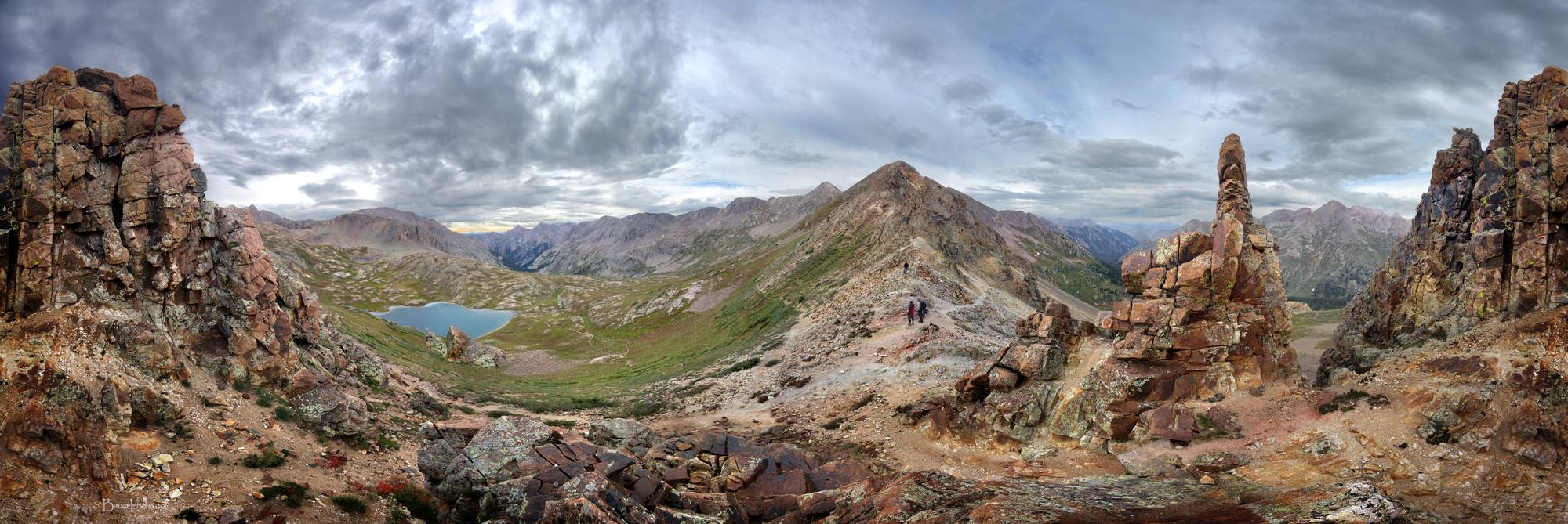 Hikers on Columbine Pass - Weminuche Wilderness - Colorado Hikers on Columbine Pass with Valecito Basin to the left, and Chicago Basin to the right. Colorado, San Juan National Forest, Weminuche Wilderness, Valecito Basin.