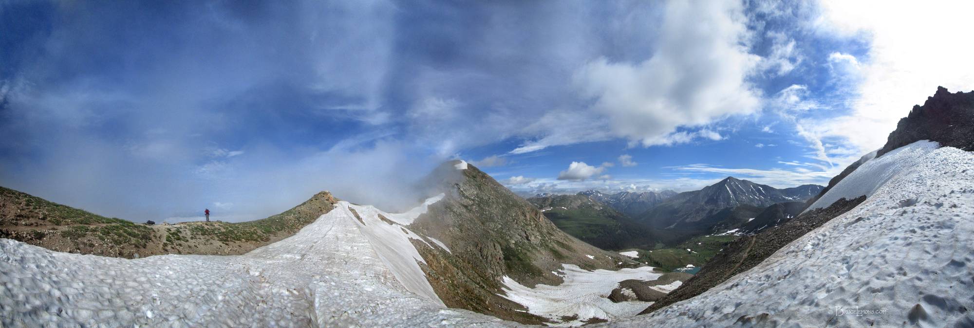 Panorama looking W at a hiker on Lake Ann Pass. Lake Ann is visible right center. Colorado, Collegiate Peaks Wilderness, Lake Ann Pass. Colorado Trail Collegiate West mile 203.