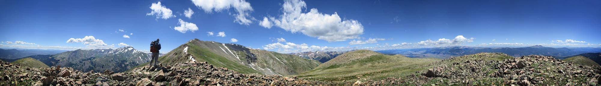 Panorama looking WSW up ridge to Mt oxford at center, just right of hiker, Mt Harvard across Pine Creek valley just left of hiker, Mt Columbia just left far behind Mt Harvard, and Clear Creek Reservoir in the Arkansas River valley at center right. Off the Colorado Trail near mile 196.
