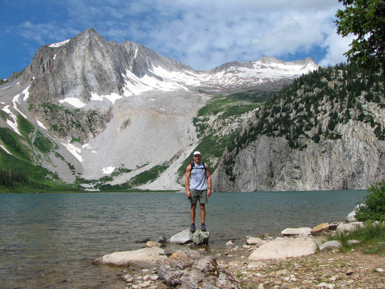 Snowmass Lake Hiker - Maroon Bells Wilderness - Colorado Hiker at Snowmass Lake under Snowmass Peak. Colorado, White River National Forest, Maroon Bells Snowmass Wilderness, Aspen, Snowmass Lake.