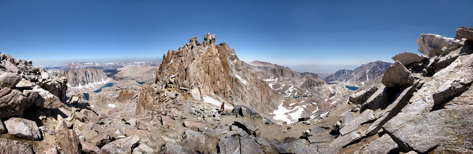 Mt Whitney Trail Crest panorama looking to West and East sides of the Whitney ridge. To the left is the backside of Mt Whitney, Hitchcock Lakes, Hitchcock peak, and Guitar Lake in the distance nearer center. To the immediate right are the 96 switchbacks down to Trailcamp by the middle lake, above which rises Wotans Throne at center right. Farther back/right is Consultation Lake. Barely visible way down Lone Pine Creek valley is Lone Pine Lake, just a few miles above the Whitney Portal trailhead. Mt Whitney is hidden behind the ridge at center. California, Sierra Nevada Mountains, Sequoia National Park, Mt Whitney Trail, Trailcrest. John Muir Trail Mile 212.