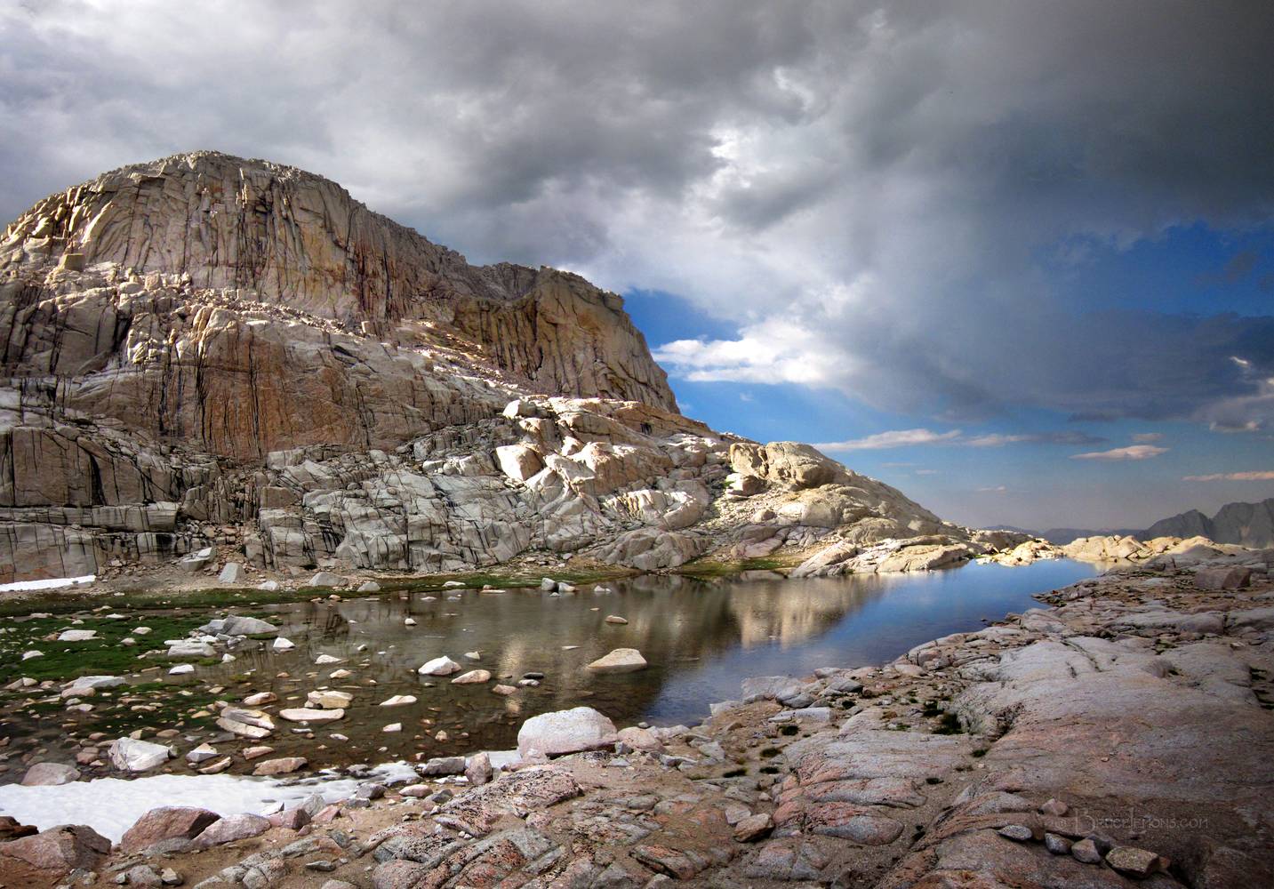 Wotans Throne Over Trail Camp Lake - Mt Whitney Trail Looking ENE across Trail Camp Lake to Wotans Throne on the left. California, Sierra Nevada Mountains, John Muir Wilderness, Mt Whitney Trail, Trailcamp. John Muir Trail Mile 214.