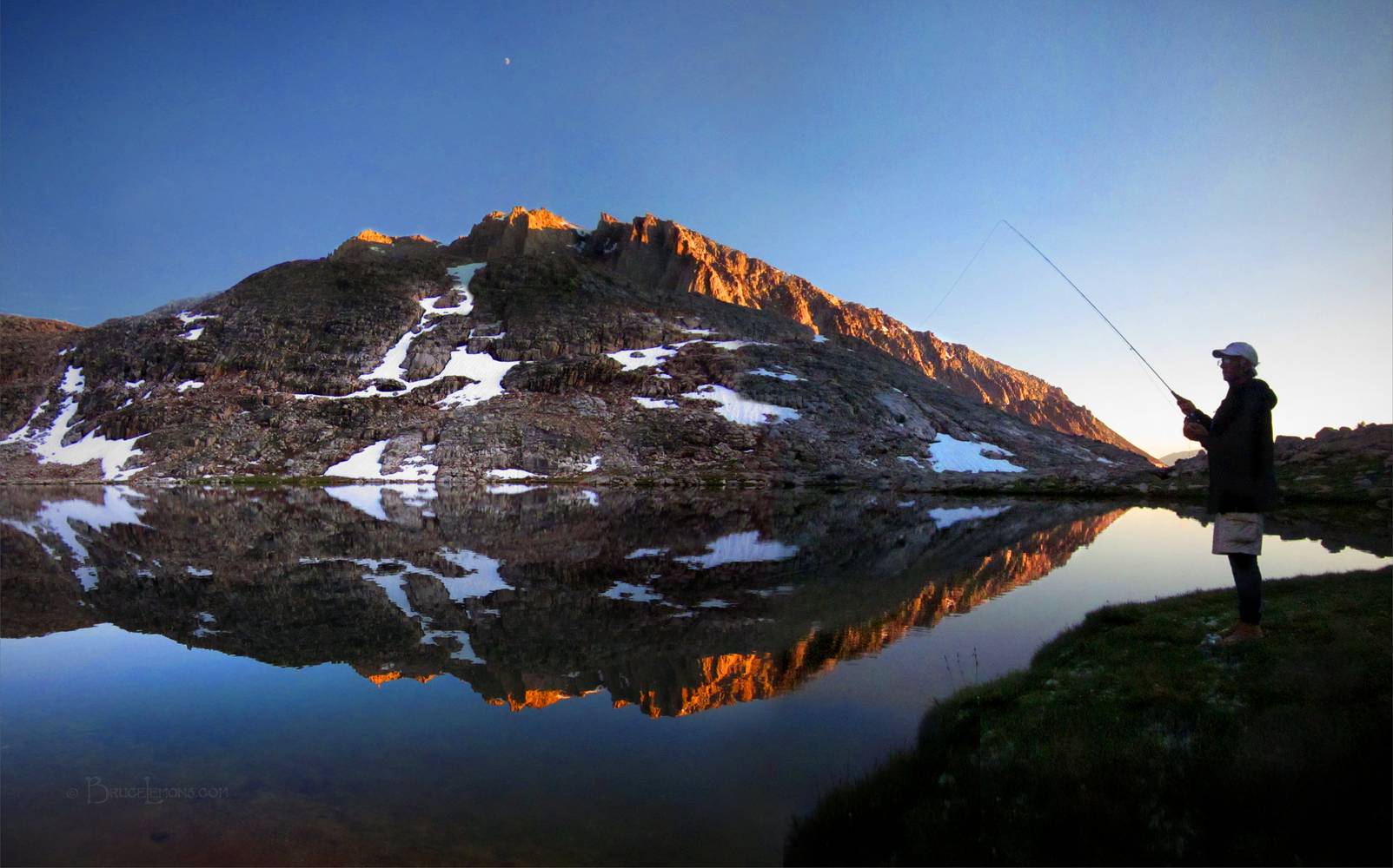 Fishing Guitar Lake at Sunset - John Muir Trail Silhouette of a fly fisherman at Guitar Lake at sunset. California, Sierra Nevada Mountains, Sequoia National Park, Guitar Lake. John Muir Trail Mile 206.