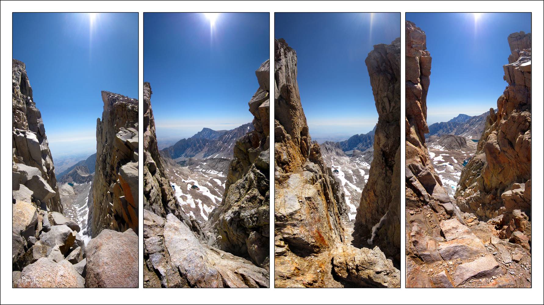 Mt Whitney Windows - John Muir Trail View E towards owens Valley through windows between Needles on the Mt Whitney Trail. California, Sierra Nevada Mountains, Sequoia National Park, Mt Whitney Trail. John Muir Trail Mile 209.