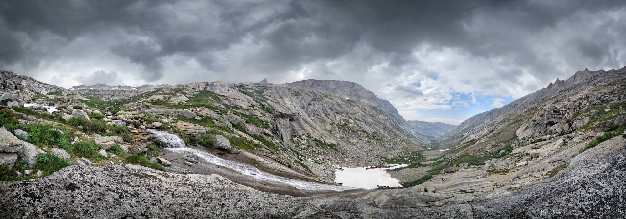 Panorama looking SW up to Elizabeth Pass and NW down Deadman Canyon. California, Sierra Nevada Mountains, Kings Canyon National Park, Deadman Canyon. Off the John Muir Trail near Mile 199.