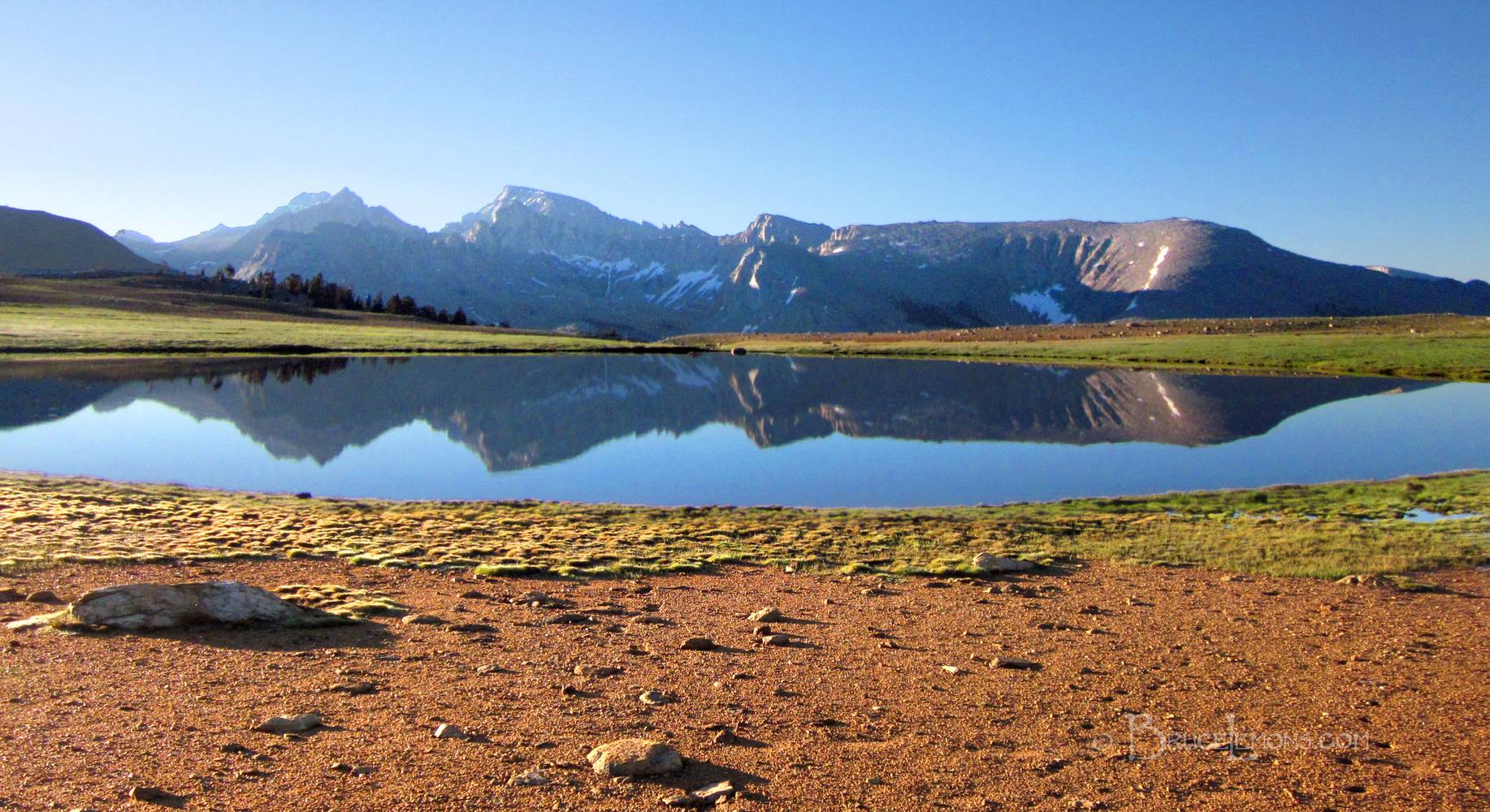 Mt Whitney Over Bighorn Plateau Lake Shore - John Muir Trail Looking SE to Mt Whitney over the Bighorn Plateau Lake in evening light. California, Sierra Nevada Mountains, Sequoia National Park, Bighorn Plateau. John Muir Trail Mile 196.