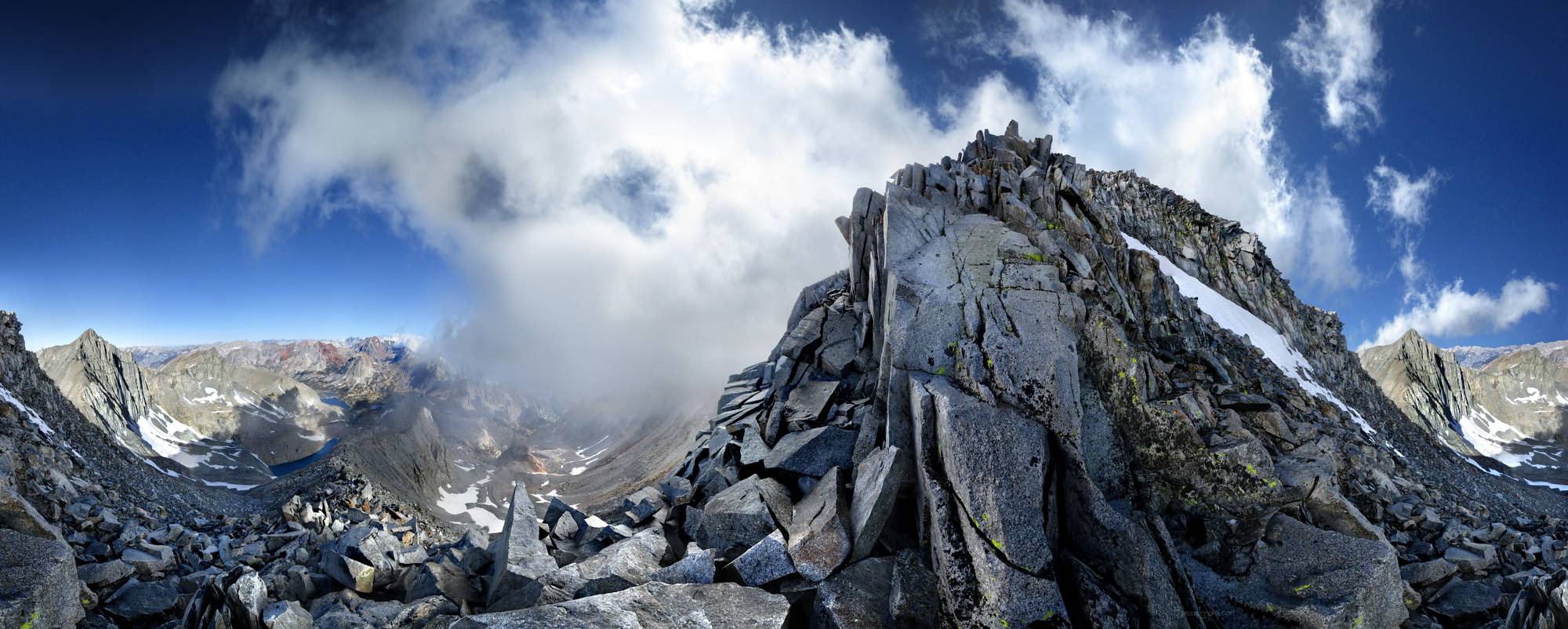 On the N ridge just below the summit of Baxter Peak, with Acrodectes Peak at far left, Stocking and Woods Lakes below, and Sawmill Pass at center. California, Sierra Nevada Mountains, Kings Canyon National Park, Baxter Peak. Off the John Muir Trail near Mile 173.
