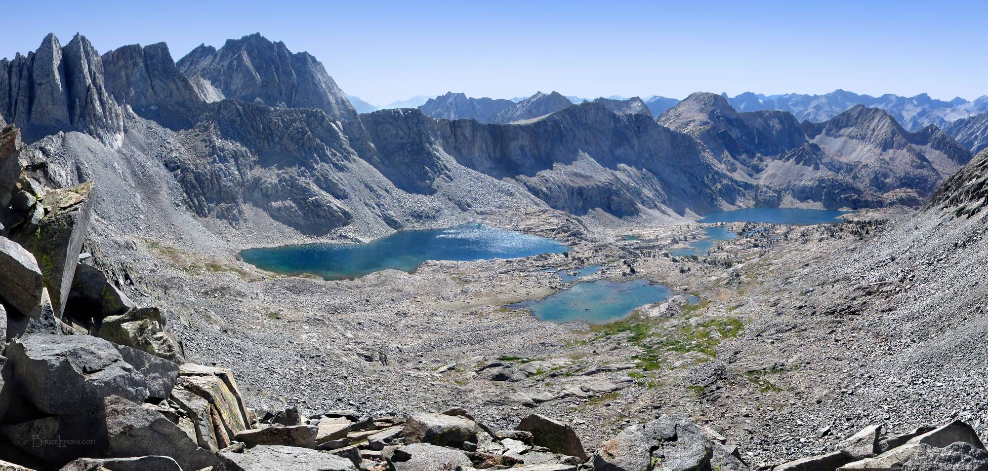 Looking West from Amphitheater Pass over Amphitheater Lakes Basin. California, Sierra Nevada Mountains, Kings Canyon National Park, Wales Lake. Off the John Muir Trail near Mile 154.