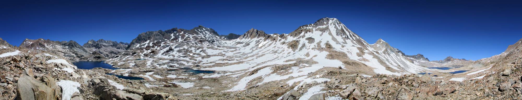 Muir Pass panorama from high above on the Mt Warlow Ridge/Goddard Divide about a mile North of the JMT, overlooking the trail as it winds from far right through Evolution Basin by Wanda and McDermand Lakes, over Muir Pass and by the hut at center, with Mt Solomons rising behind, and down left between the Black Divide and Helen Lake at left before dipping out of sight towards LeConte Canyon at the Helen outlet center left. California, Sierra Nevada mountains, Kings Canyon National Park. John Muir Trail Mile 129.