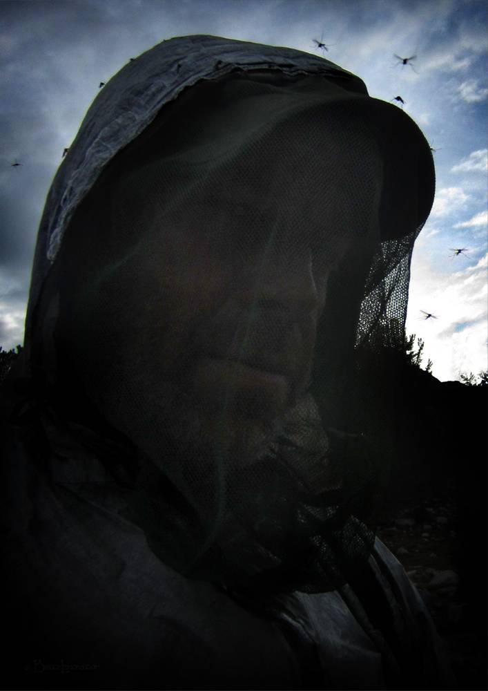 Mosquitoes swarming a hiker. California, Sierra Nevada Mountains, John Muir Wilderness, Rose Lake. Off the John Muir Trail near Mile 098.
