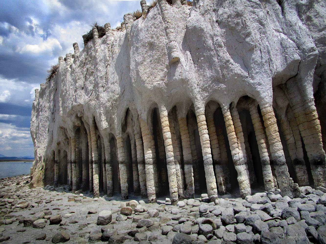 Solidified volcanic ash column formations along the South shore of Crowley Lake in Owens Valley near Mammoth Lakes. California, Sierra Nevada Mountains, Owens Valley, Crowley Lake. Off the John Muir Trail near Mile 077.