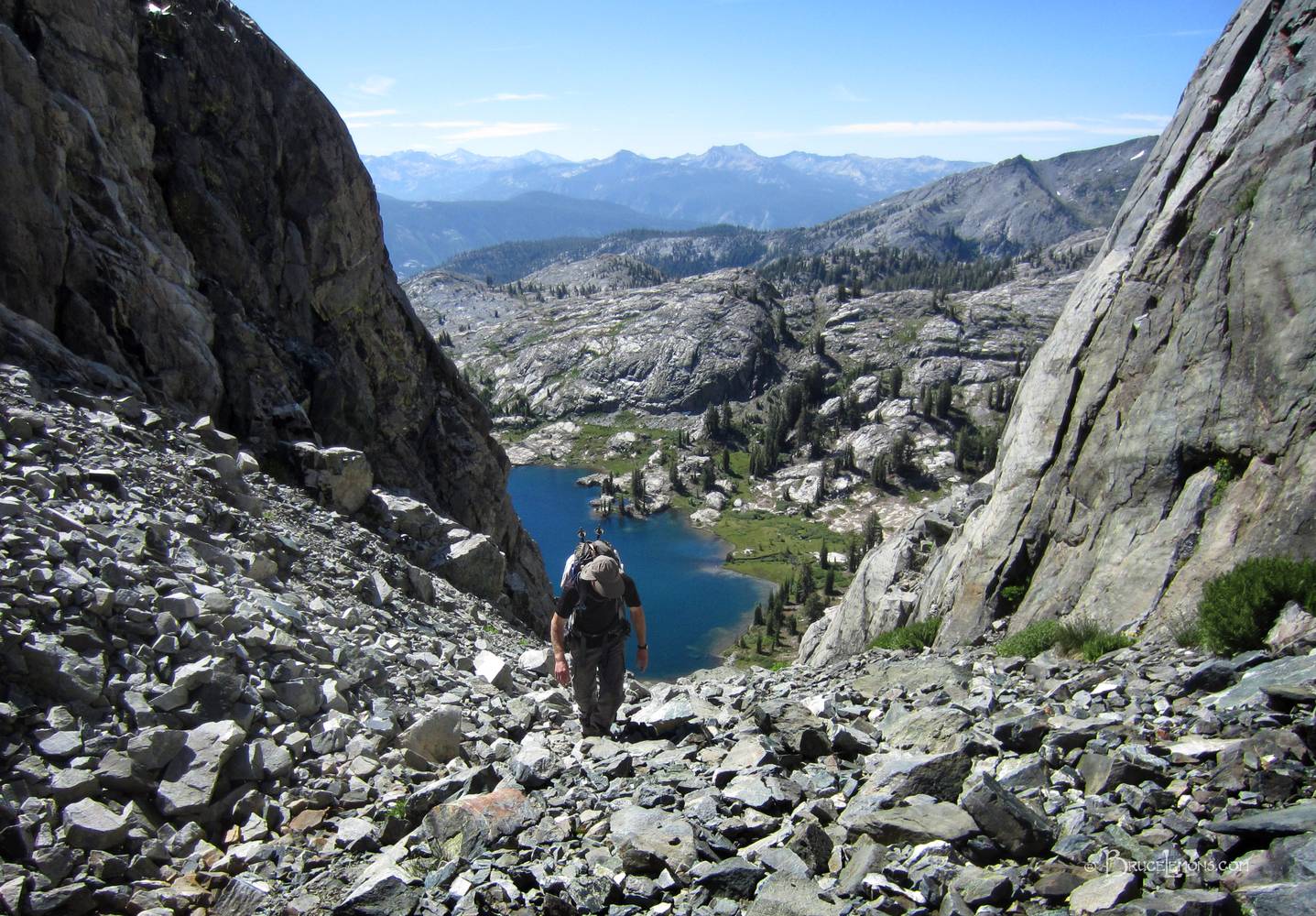 Above Holcomb Lake - Sierra Crossing between Holcomb and Beck Lakes under the Minarets. California, Sierra Nevada Mountains, Ansel Adams Wilderness, Holcomb Lake. Off the John Muir Trail near Mile 056.