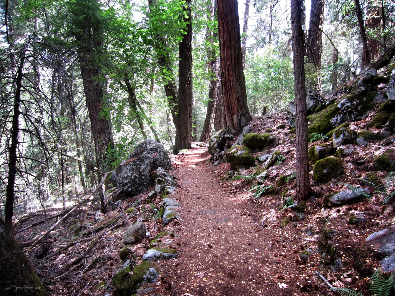 Near the W end of Yosemite Valley and the Pohono Bridge on the Valley Loop Trail. California, Sierra Nevada Mountains, Yosemite, Yosemite Valley. Off the John Muir Trail near Mile 000.