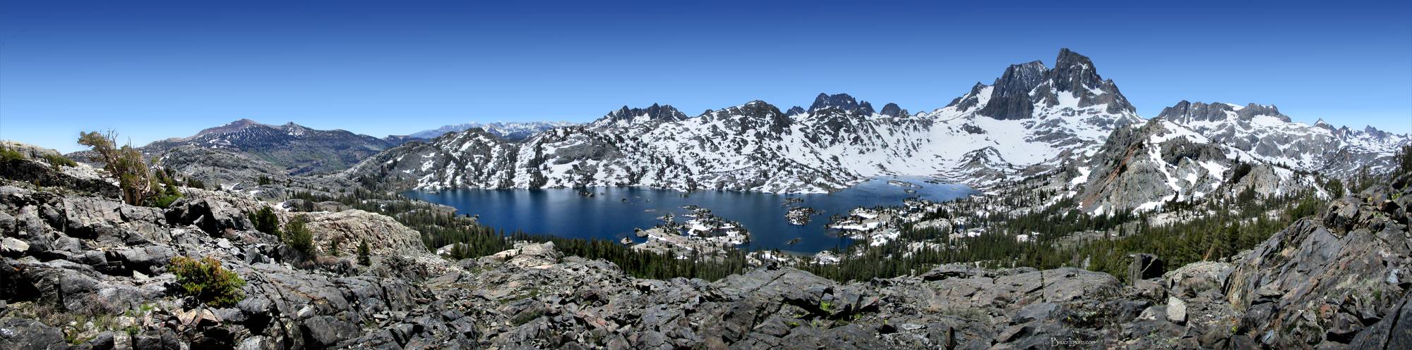 Garnet Lake and Banner Peak from High Up - Sierra Nevada Mountains Garnet Lake and Banner Peak viewed from high on the ridge North of the lake. California, Sierra Nevada Mountains, Ansel Adams Wilderness. Off the John Muir Trail near Mile 046.
