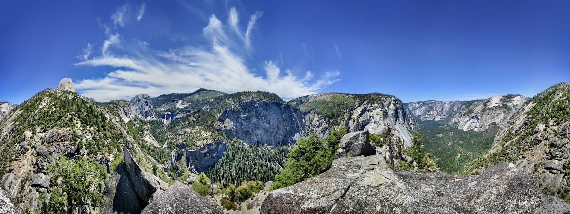360 Panorama looking SSW from Grizzly Peak, overlooking the Mist Trail at left, and Yosemite Valley at right, with, left to right, Half Dome, Mt Broderick, Liberty Cap, Nevada Fall/Emerald Pool/Vernal Fall along the Mist Trail, Illouette Canyon, Glacier Point, Yosemite Valley, Yosemite Falls, Royal Arches, and North Dome. California, Sierra Nevada Mountains, Yosemite, Grizzly Peak. Off the John Muir Trail near Mile 001.