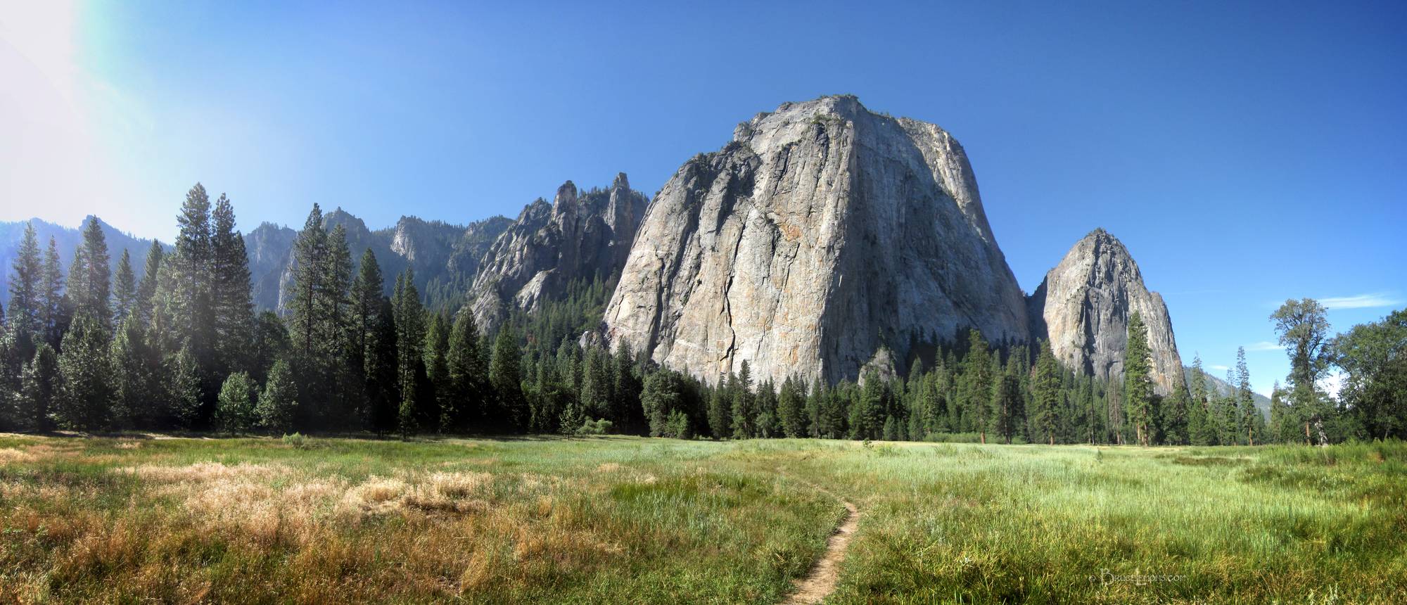 Cathedral Rocks from El Capitan Meadow - Yosemite Valley Cathedral Rocks from El Capitan Meadow. California, Sierra Nevada Mountains, Yosemite National Park, Yosemite Valley, El Capitan Meadow. Off the John Muir Trail near Mile 000.