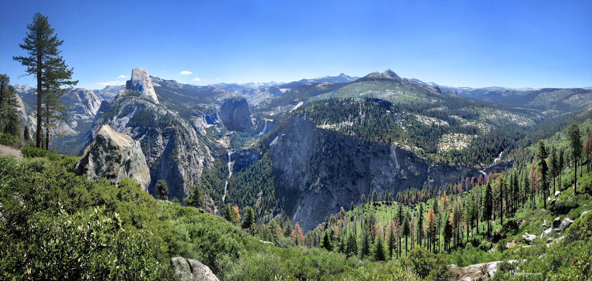 Half Dome Nevada and Vernal Falls from Panorama Trail - Yosemite Valley Half Dome, Nevada Fall, and Vernal Fall from Panorama Trail. California, Sierra Nevada mountains, Yosemite National Park. Off the John Muir Trail near Mile 003.