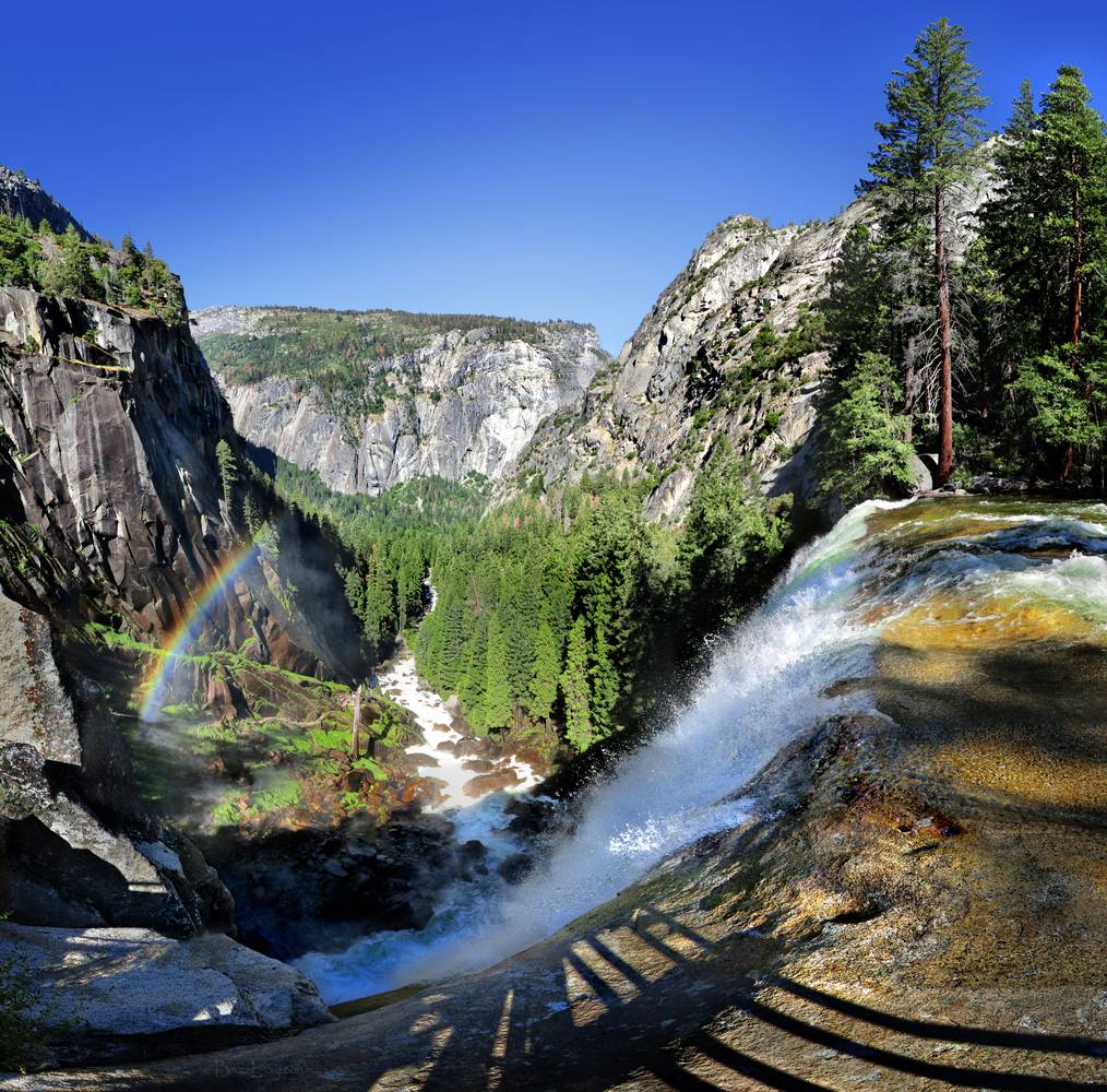 Vernal Fall from the Top - Yosemite Vernal Fall and rainbow viewed from atop the fall. California, Sierra Nevada mountains, Yosemite National Park, Yosemite Valley. Off the John Muir Trail near Mile 002.