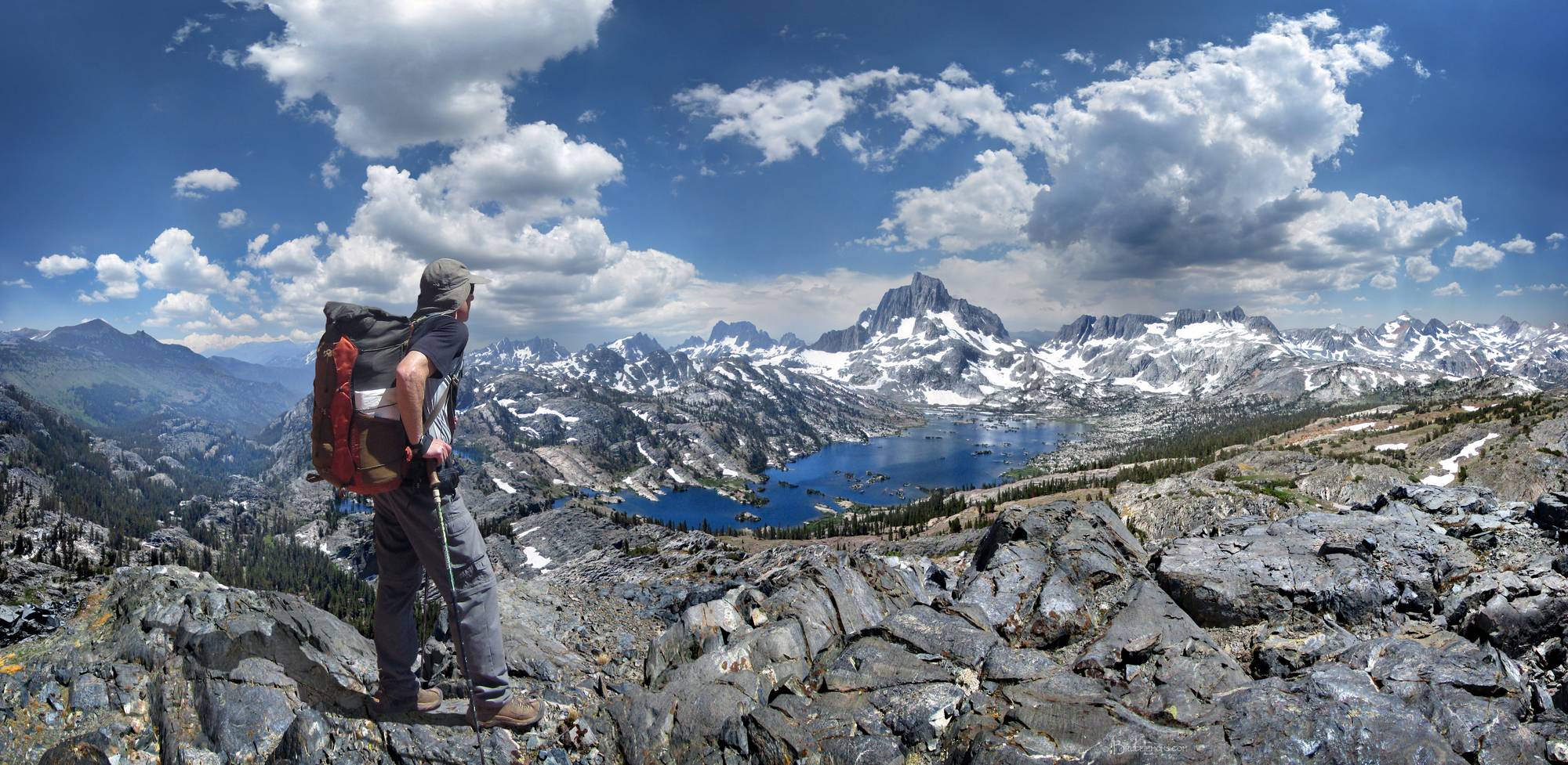 Hiker on crest N of Thousand Island Lake. Left to right are Gem Lake, Agnew Lake, Carson Peak, Clark and Summit Lakes hidden, San Joaquin Mtn, Two Teats, San Joaquin River valley, Mammoth Mtn, Badger Lakes, Ruby Lake, Emerald Lake, The Minarets, Thousand Island Lake, Banner Peak, Mt Ritter hidden behind, Mt Davis, Rodgers Peak, Mt Lyell, Donahue Pass, Mt Donahue, Waugh Lake hidden, Weber Lake. California, Sierra Nevada Mountains, Ansel Adams Wilderness, Thousand Island Lake. Off the John Muir Trail near Mile 044.