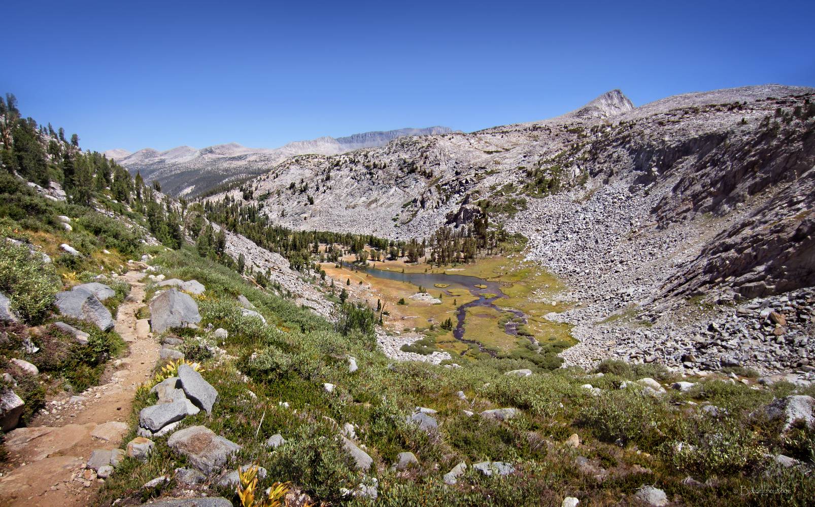 Looking NNE down over the lake at the headwaters of the Lyell Fork of the Tuolumne River at the top end of Lyell Canyon approximately one and a half miles below Donahue Pass. California, Sierra Nevada Mountains, Yosemite National Park, Lyell Canyon. John Muir Trail Mile 035.