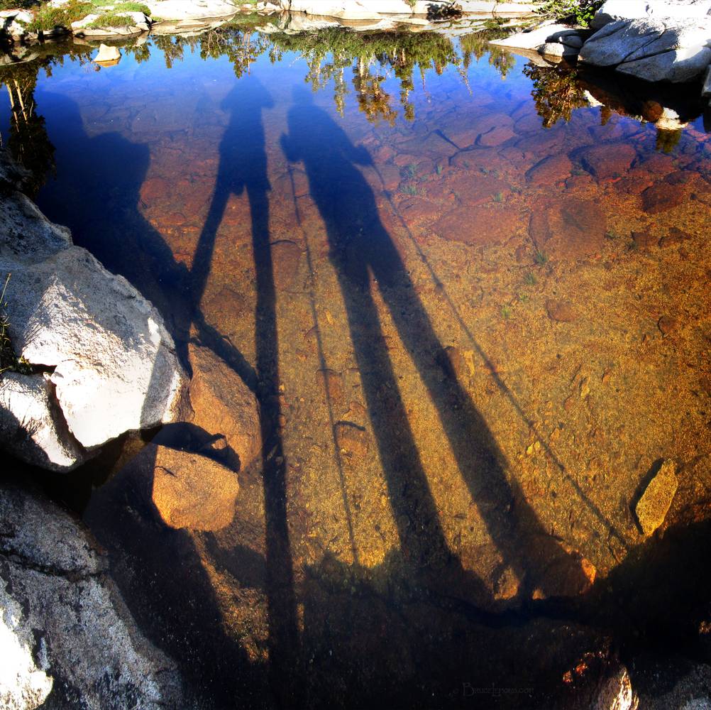 Hiker Shadows at Bernice Lake - Yosemite Hiker shadows on a pond by Bernice Lake. California, Sierra Nevada Mountains, Yosemite, Bernice Lake. Off the John Muir Trail near Mile 026.