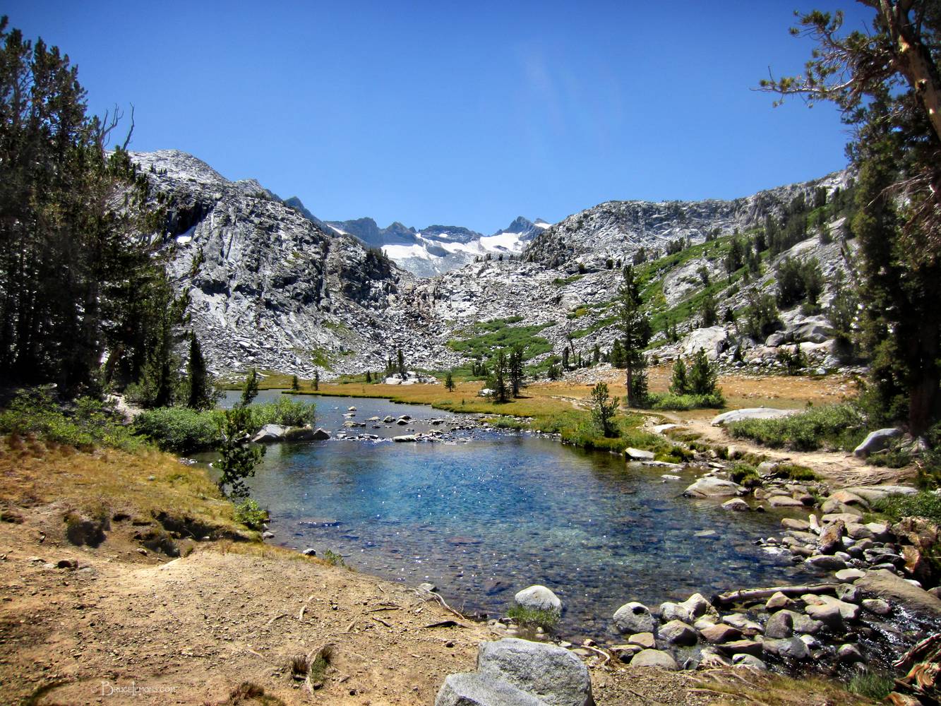 Looking S across lake from crossing of Lyell Fork of the Tuolumne River headwaters at the top of Lyell Canyon 2 miles below Donahue Pass. California, Sierra Nevada Mountains, Yosemite National Park, Lyell Canyon. John Muir Trail Mile 034.