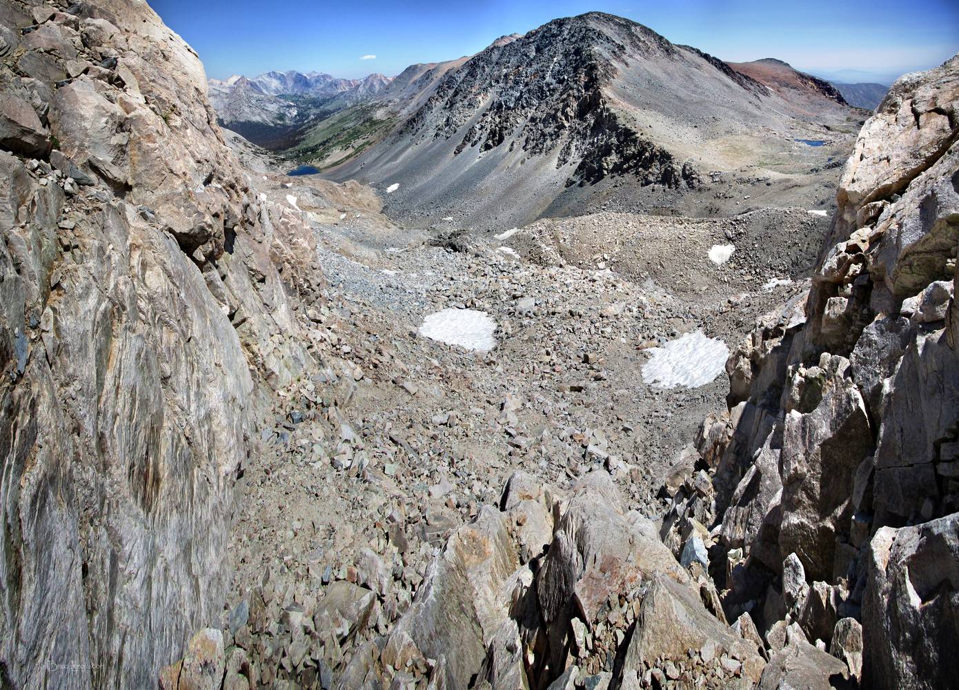 Looking N to Excelsior Mtn and Virginia Canyon from a chute up the N side of Shepherd Crest East. California, Sierra Nevada Mountains, Yosemite, Shepherd Crest East. Off the John Muir Trail near Mile 023.