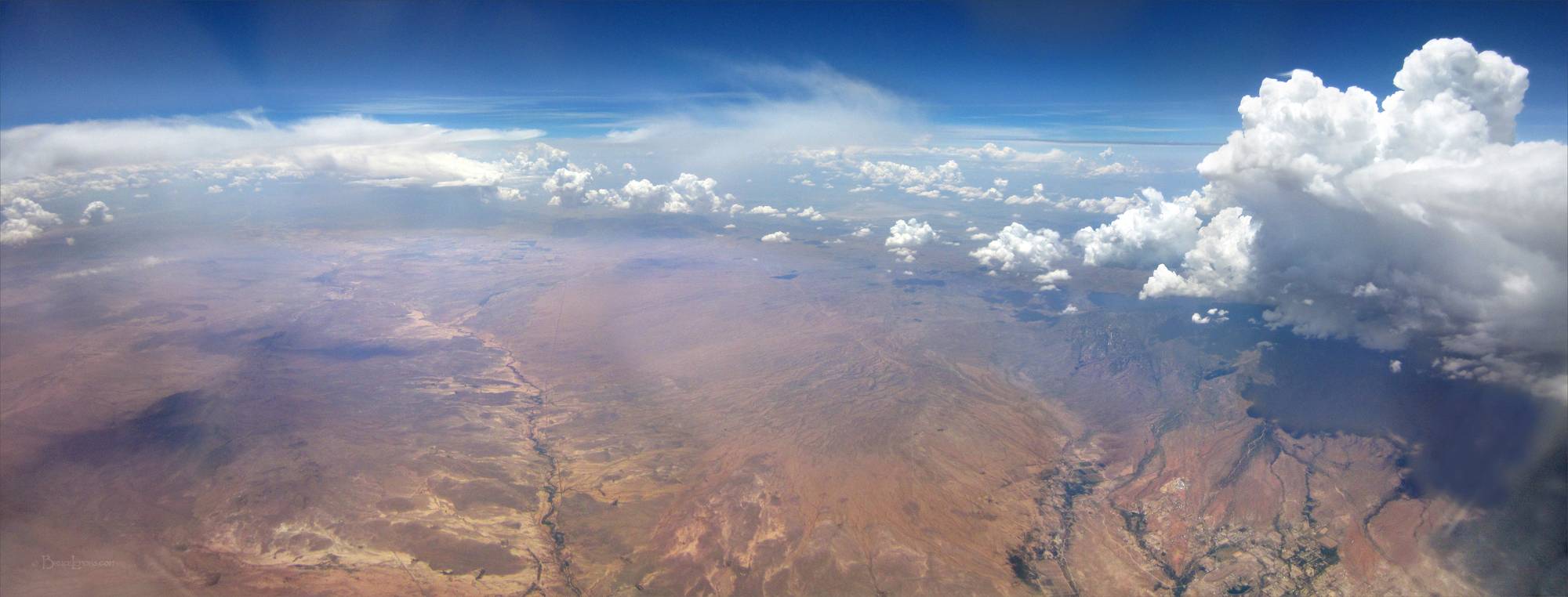 Panorama of an arid Utah landscape and cloudscape from an airplane at 36,000 feet.