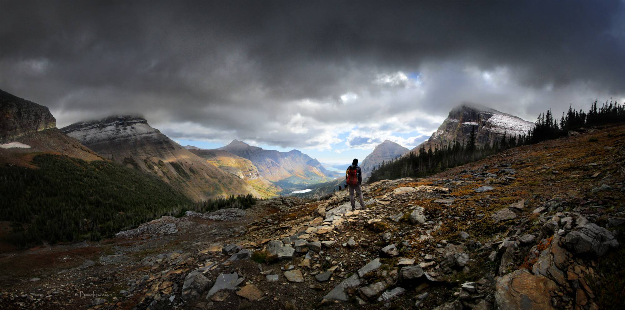 Looking East from Swiftcurrent Pass to Redrock Lake, Many Glacier, and Lake Sherburne on the horizon. Mt Wilbur is at left, Mt Grinnell is at left, both in clouds, while Altyn Peak and Grinnell Point flank Many Glacier and the trail end to left and right of center. Glacier National Park, Montana.