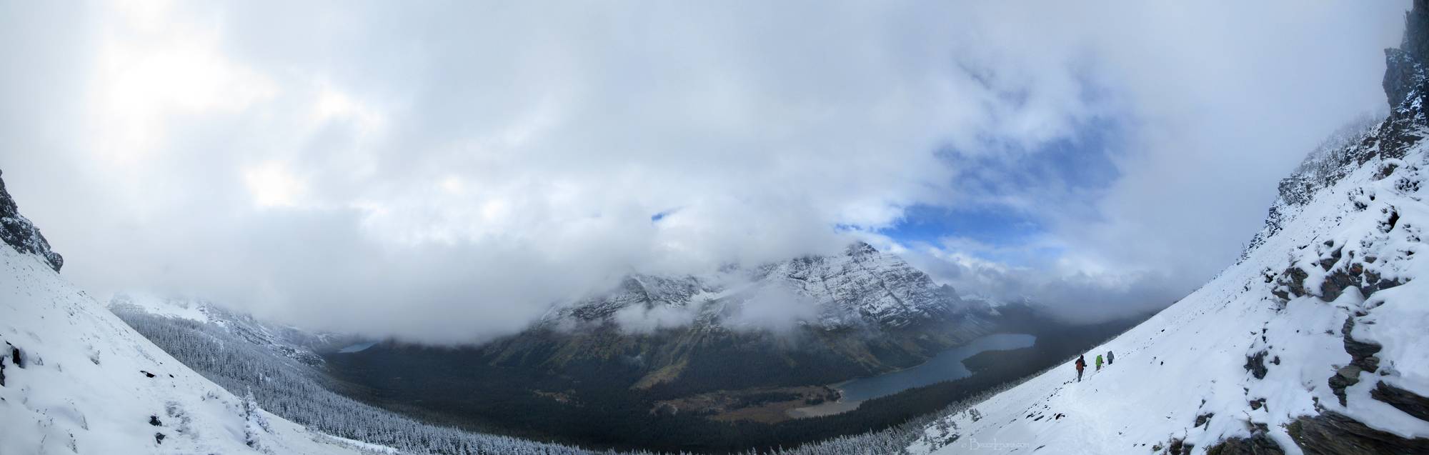 Snow hiking down the Ptarmigan Trail North from the pass, overlooking Elizabeth Lake, in Glacier National Park, Montana.
