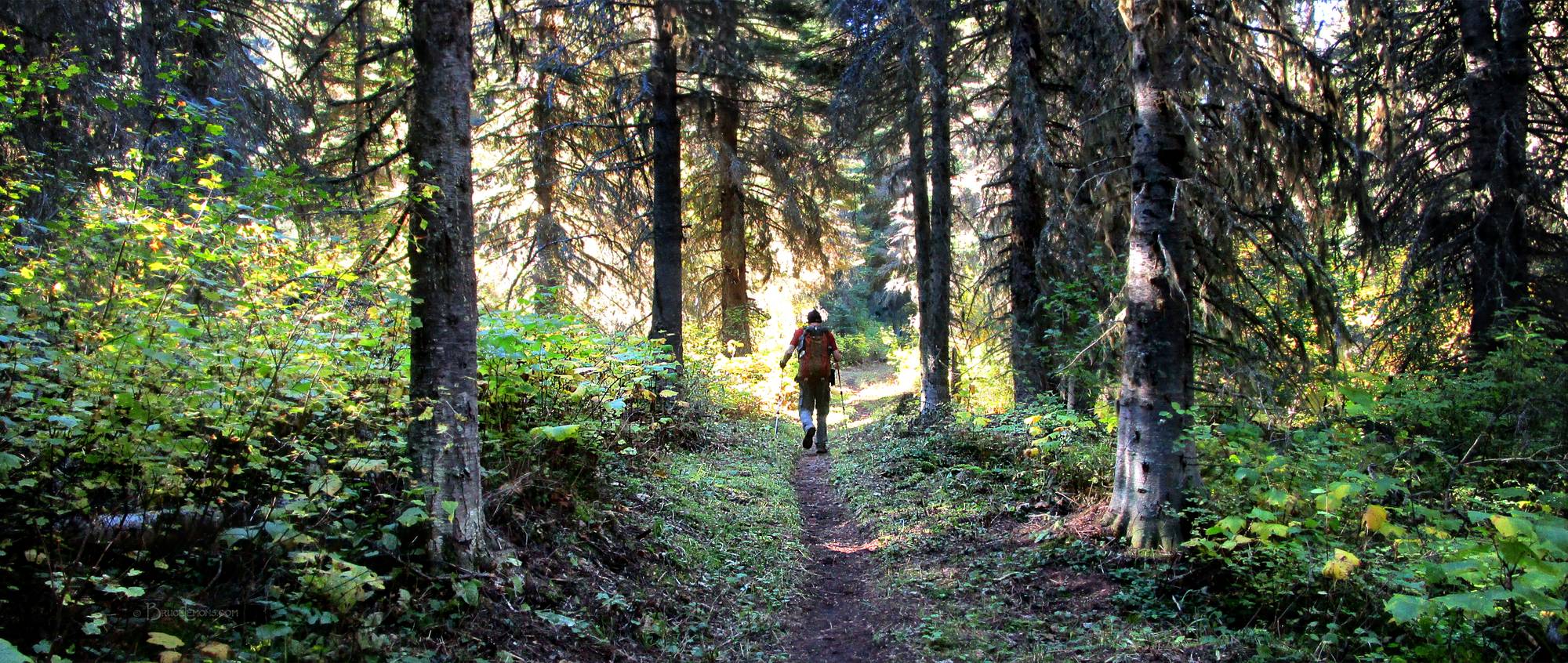 Waterton Valley Trail Detail - Glacier National Park Hiker in the deep woods of lower Waterton Valley Trail / Continental Divide Trail. Glacier National Park, Montana.