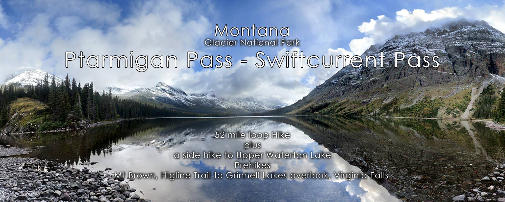 Early September, 7 day, 56 mile loop hike from Ptarmigan Pass trailhead to Swiftcurrent Pass trailhead at Many Glacier in Glacier National Park, Montana. Pre hikes of Mt Brown, Grinnell Overlook, and Virginia Falls. Fresh snowfall on Ptarmigan Pass, and Fall color on the Highlineline Trail.