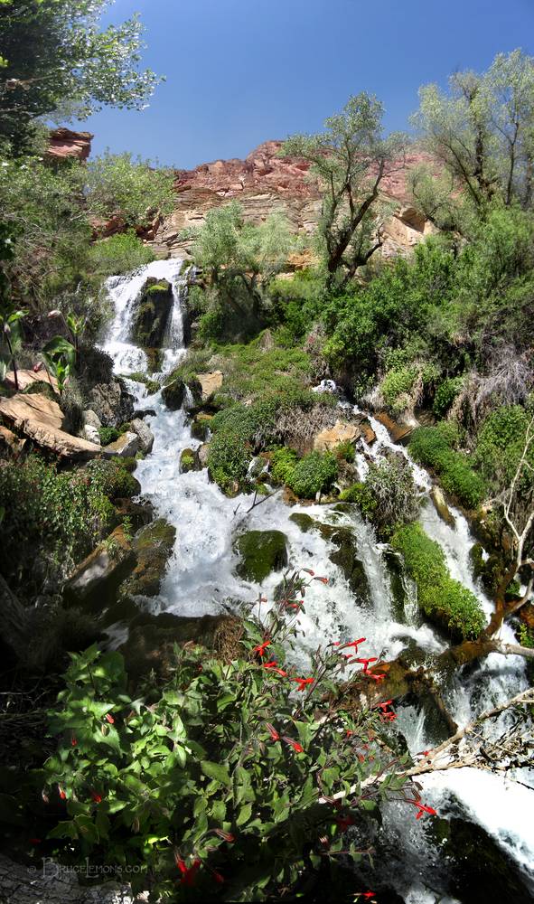 Looking N up from low on Thunder River Falls through Red Salvia wildflowers. Arizona, Grand Canyon National Park, North Rim, Bill Hall Trail, Thunder River.